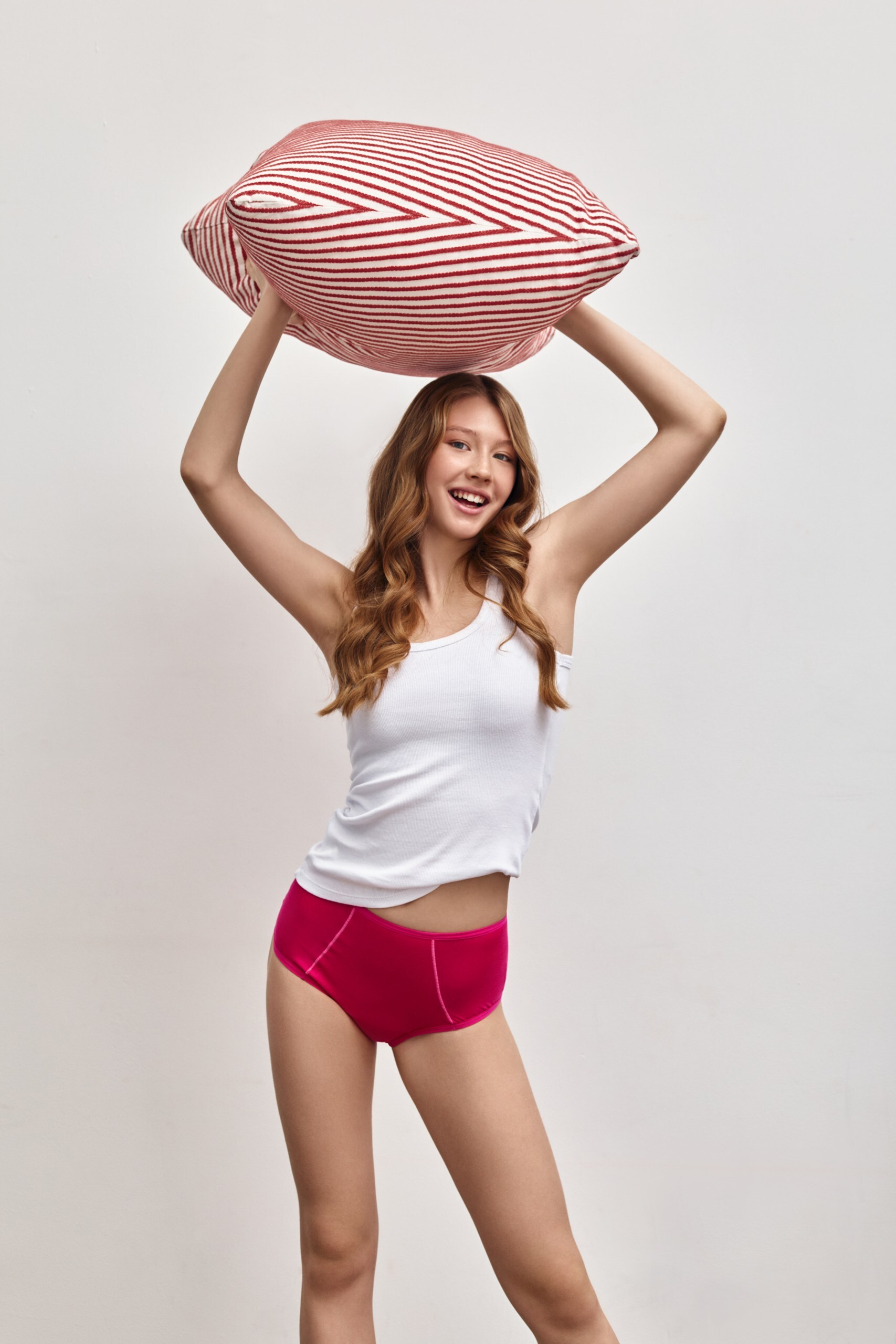 Модель Body Again - это наша идеальная новинка в цвете фуксия для подростков, когда хочется яркости и важно сохранить комфорт в любые дни. Такие трусы выдерживают умеренные выделения и заменят вам 3 тампона или 3 прокладки в день. Вы можете носить их без смены и риска неприятных ситуаций до 12 часов благодаря специальной 4-слойной конструкции и дышащей ластовице.